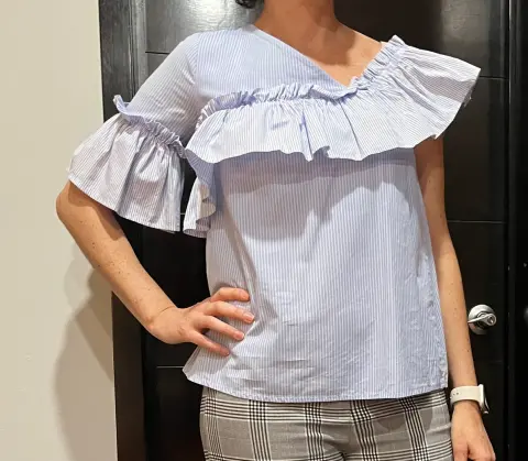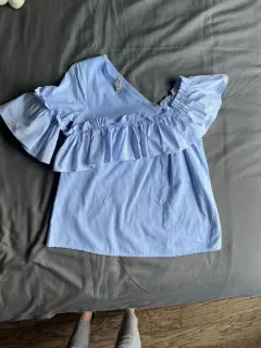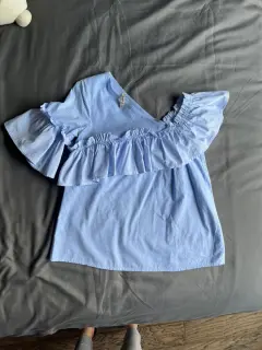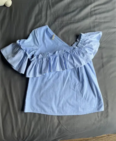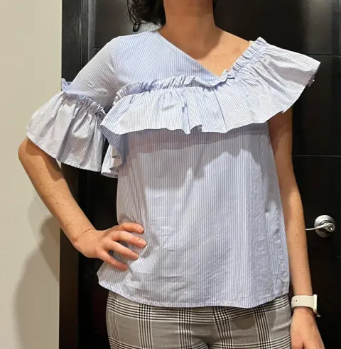 Camisa azul clarito. Hermosa camisa sin botones con media manga completa de Olán de la marca Stradivarius talla s 41cm de axila a axila Azul clarita con rayas blancas