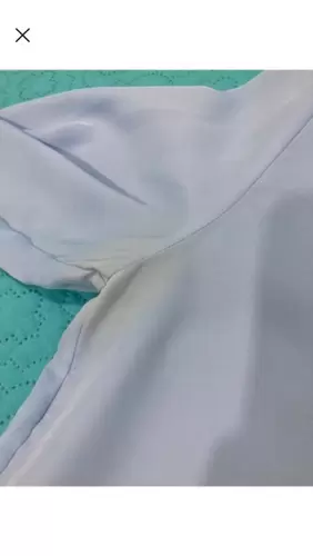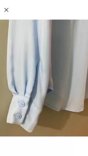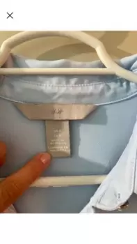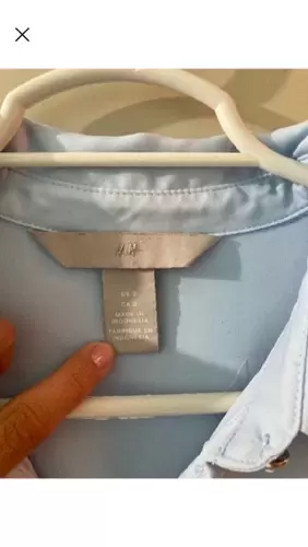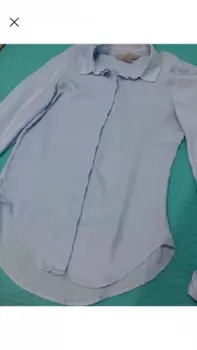Camisa azul H&M. Es azul cielo, el color se ve mas vibrante en vivo. Recomiendo a una talla M o incluso G porque viene bastante holgada. Tiene mancha en la axila por el uso (subo foto)