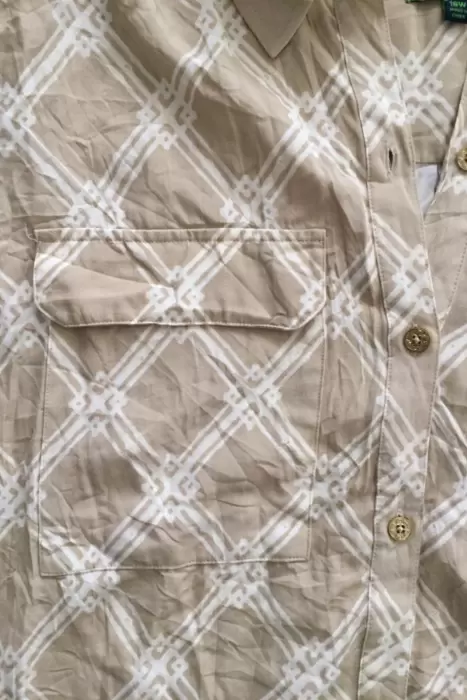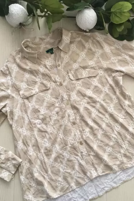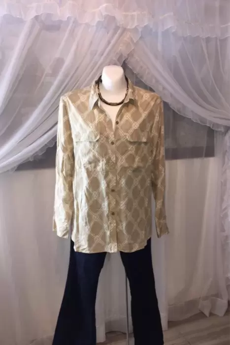 Camisa beige. Camisa manga larga color beige, la tela es suave y fluida no tan acarpetada, viene con botones y bolsillos al frente, las mangas traen boton para arremangar