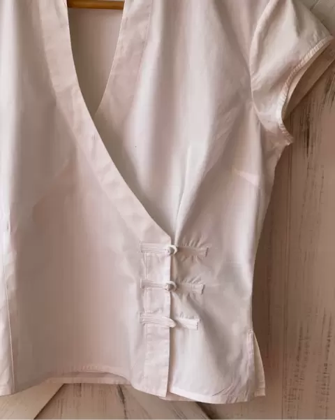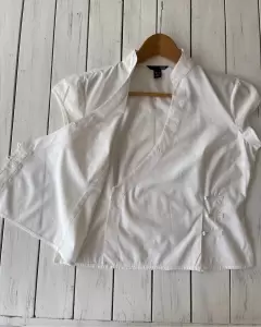 Talla: M (10)Medidas: 44 cm hombros, 51.5 cm axila y 52.5 cm largo. Camisa manga corta, escote en V, se abotona al frente
