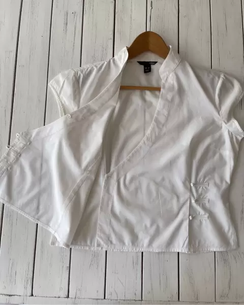 Camisa blanca manga corta H&M. Talla: M (10)Medidas: 44 cm hombros, 51.5 cm axila y 52.5 cm largo. Camisa manga corta, escote en V, se abotona al frente