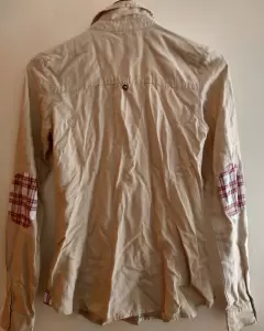 Camisa color Caqui Marca Bershka, no estoy segura de la talla, pero si es CH/S/XS, más o menos. La camisa está muy bonita, la tela no es tan gruesa por lo que no te acaloras cuando la usas, tiene todos sus botones, es usada pero está en muy buenas condiciones, sin enmendaduras, sin manchas que alteren el diseño o el color sin detalles exteriores, la tela es de fácil planchado y lavado, no es rígida, es suave y no pica.
