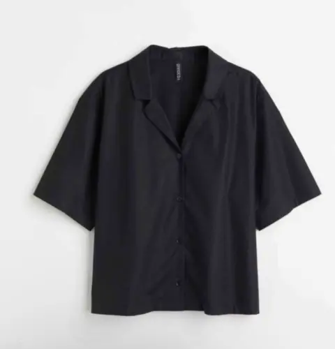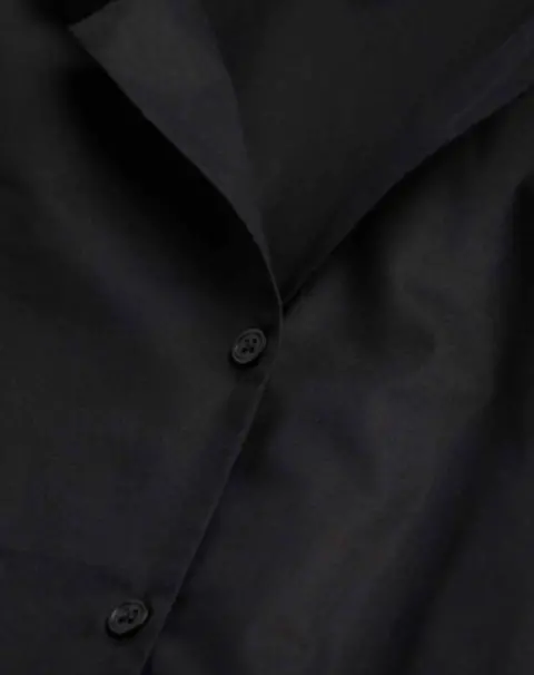 Camisa crop negra tipo polo, es corta, la tela es muy delgada y fresca
