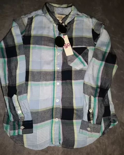 Camisa de cuadros casual azul de cuadros, nueva con etiqueta, talla chica.Acepto ofertas razonables.No incluye accesorios.Si te agrada alguna otra prenda puedo hacerte descuento