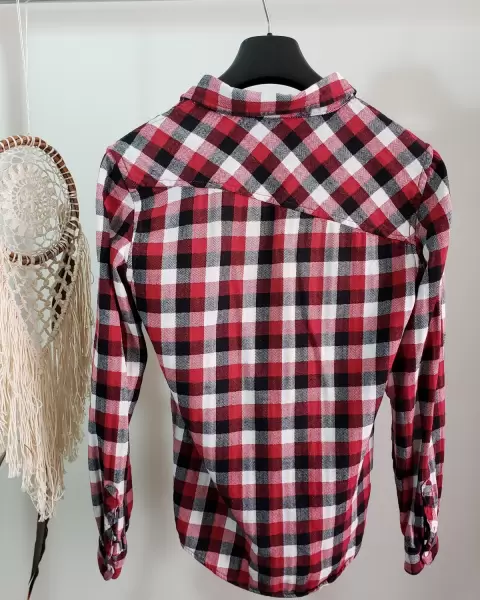 Clásica camisa de cuadros blanco, negro y rojo, en muy buen estado. Es calientita y de algodón, dice talla grande pero queda a un mediano