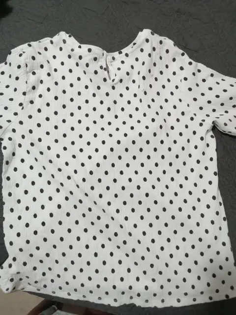 Camisa blanca con puntitos negros talla 10 de Zara, no sé plancha y es. Muy cómoda. Se ve elegante y coqueta.