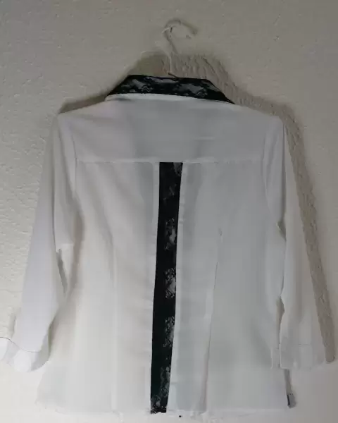 Camisa blanca lisa medio transparente con detalles de encaje negro en la zona de botones, cuellos y puñosIdeal para,llevar con un pantalón negro elegante