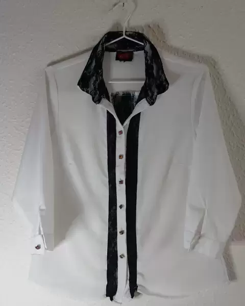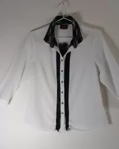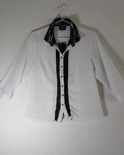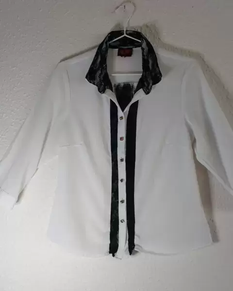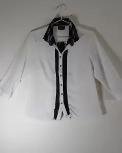 Camisa de vestir blanca con detalles nefros. Camisa blanca lisa medio transparente con detalles de encaje negro en la zona de botones, cuellos y puñosIdeal para,llevar con un pantalón negro elegante