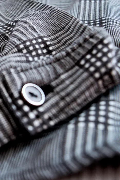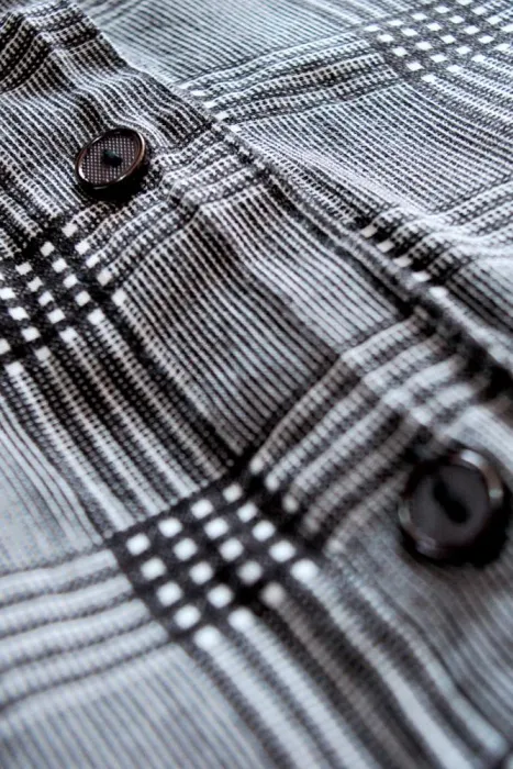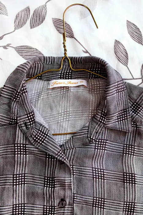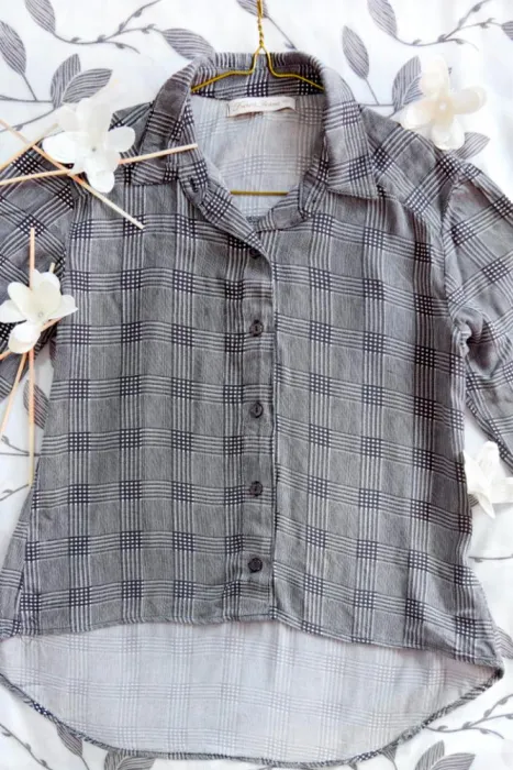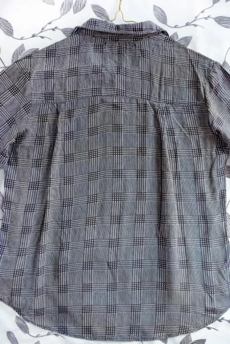 Camisa estampada a cuadros gris. *Camisa con corte "cola de pato"*Tela: 100% Rayón*Alto frente: 46cm*Alto detrás: 58cm*Hombros: 40cm*Cuello: 14-14.5 pulg.*Etiqueta Furor Products