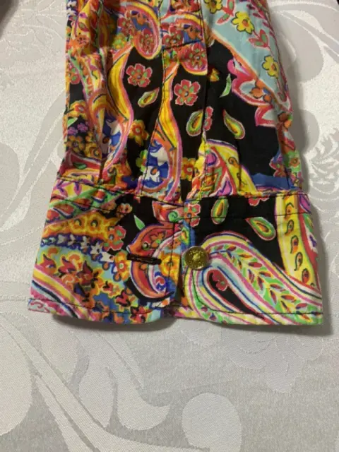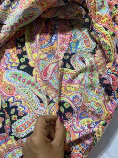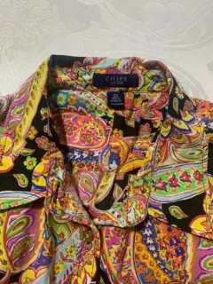 Camisa de cuello formal, manga larga con botones enfrente, tiene 2 pinzas en la parte de la espalda, tela estampada de algodón.Medidas/ espalda: 44 cm, busto: 65 cm, cintura: 74 cm, largo: 68 cm.