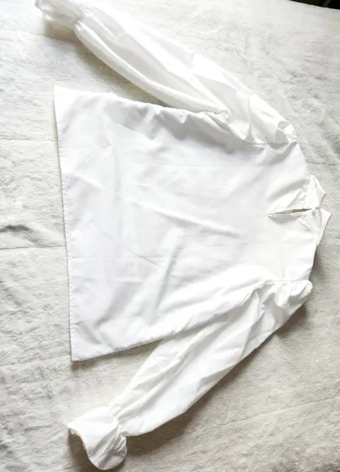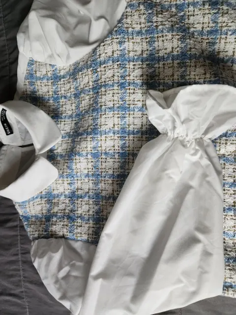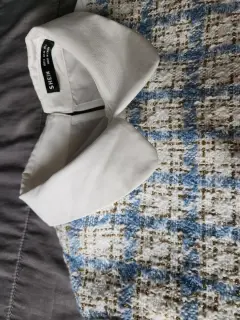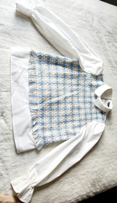Camisa formal coqueta. Camisa blanca, con delantera de tela gruesa cuadriculada color azul cielo y detalles dorados, maga larga, tipo globo puño acampanado, es topo casual formal.