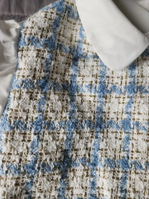 Camisa blanca, con delantera de tela gruesa cuadriculada color azul cielo y detalles dorados, maga larga, tipo globo puño acampanado, es topo casual formal.