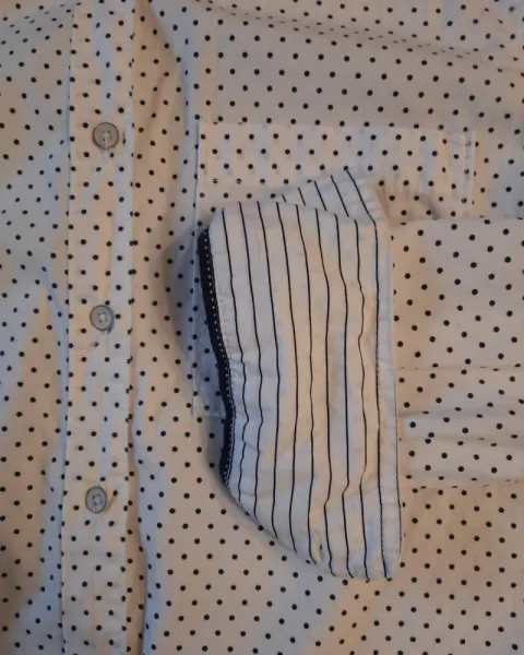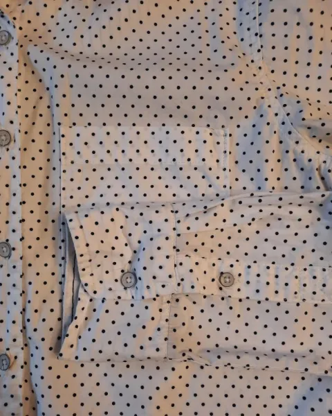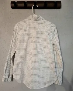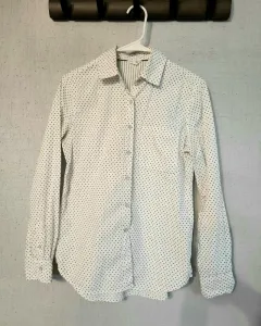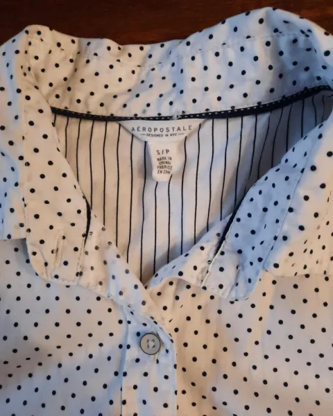 Camisa talla S Aeropostale dama, blanca con lunares azul marino. Tiene un largo de 70cm, 100% Cotton usada en una ocasión, es comoda y de excelente calidad, cuenta con dos botones extras