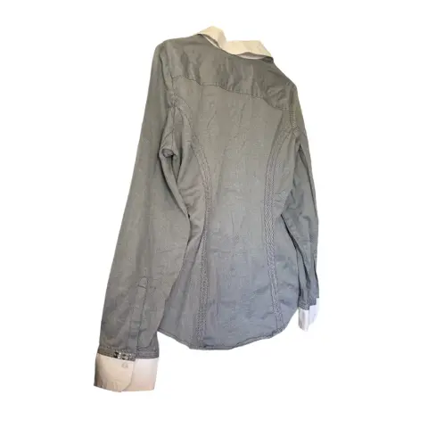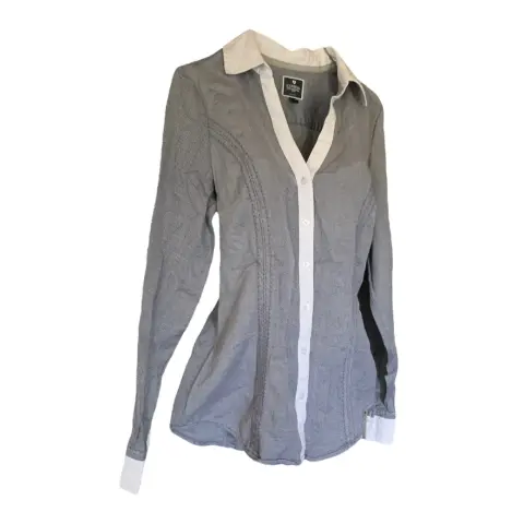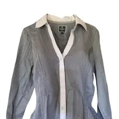 Camisa marca Express dama. Camisa esencial de manga larga con botones y cuello americano para mujer Detalles que resaltan y estilizan tu figura, además favorece tu cuello y tu bustoCuenta con mangas largas, botones en la parte delantera, cuello básico y botones en los puñosComposición: 60% algodón, 35% poliéster, 5% spandex