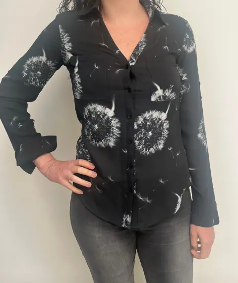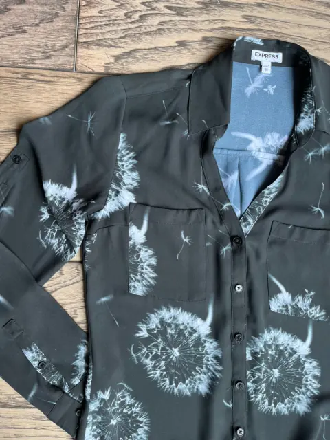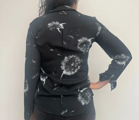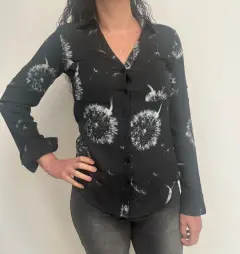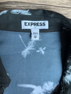 Hermosa camisa de la marca Express color negra con detalles de flor Manga larga con botones para poder hacer manga 3/4 43cm de axila a axila Puesta una sola vez