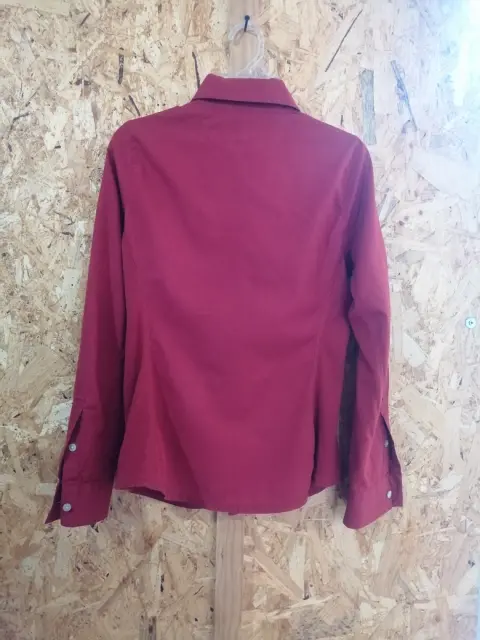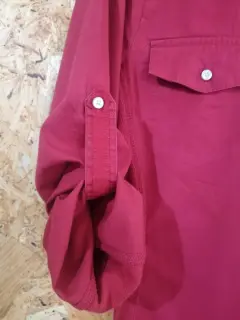 Camisa tono rojo, mangas largas con jaladera para 3/4, T-S, 96% algodón y 4% spandex, busto 44 cms. y 65 cms.