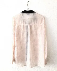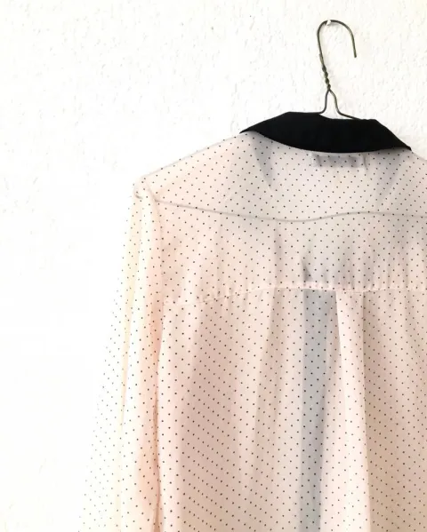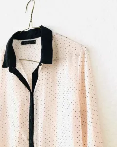 Bonita camisa, rosa clarito con puntos negros, es larga y muy delgada, luce muy bonita