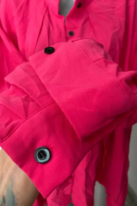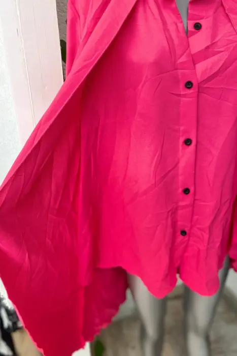 Camisa de manga larga, con olan. la parte de atrás es largo. No tiene detalles de desgaste.