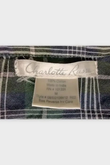 CHARLOTTE RUSSE Camisa Dama Algodón Verde M. CHARLOTTE RUSSE Camisa Dama Algodón Verde MMarca: CHARLOTTE RUSSEOrigen: IndiaMaterial: 100% AlgodónTalla: MEstilo: CamisaPatrón: EscocesColor: Verde y NegroCierre: BotónPecho: 50 cmLargo: 64 cmHombro: 36 cmManga: 23 cmRopa de USO en muy buen estado
