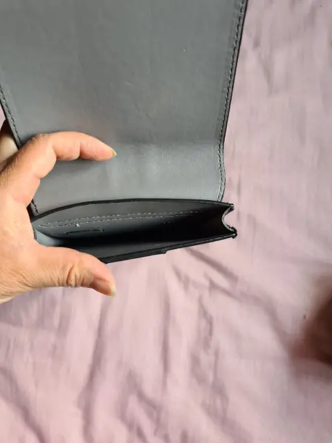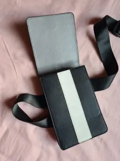 Porta celular tipo cangurera color blanco y negro, marca Kenneth Cole. Sin uso, ha estado guardada, solo tiene un detalle en la última foto; en la parte de atrás por arriba del lado derecho tiene un ligero rasguño.