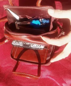 Mide 15 cm de ancho, 6cm de largo (profundidad) 10 cm de alto. La correa mide 120cm. De extremo a extremo horizontal son 40 cm de circunferencia.