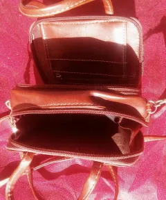 Bolsa color caramelo. Mide 15 cm de ancho, 6cm de largo (profundidad) 10 cm de alto. La correa mide 120cm. De extremo a extremo horizontal son 40 cm de circunferencia.