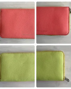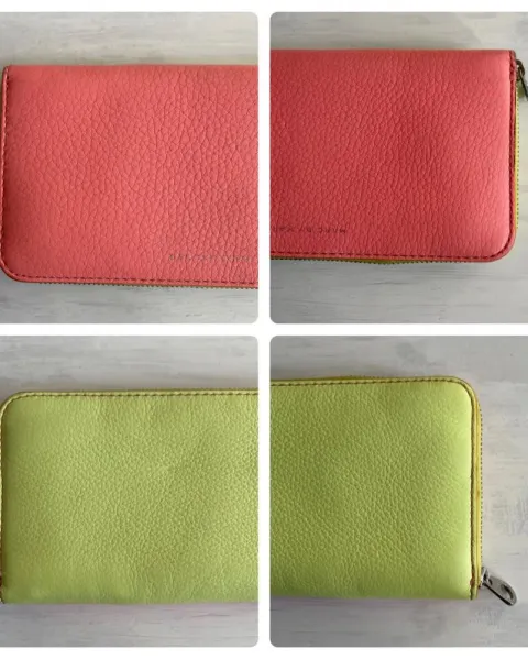 Cartera bicolor de piel rosa y verde/amarillo, con detalles de uso que se aprecian en fotos, solo estética, nada funcional. Espacio para 8 tarjetas, monedero con cierre, a este se le cayó la patita y se le puso otra. Medidas: 19.5 cm de largo, 9.5 cm de ancho y 1.5 cm grueso.