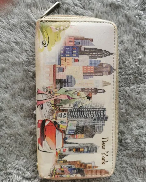 Cartera con estampado, es el mismo en ambos lados. Tiene 3 espacios, un bolsillo y lugar para tarjetas en los costados. El siper del bolsillo interior ya no tiene la jaladera.