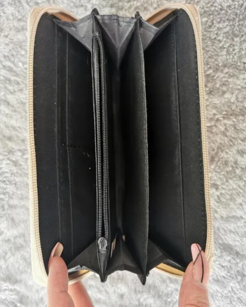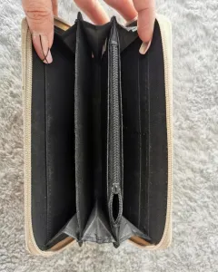 Cartera blanca estampada. Cartera con estampado, es el mismo en ambos lados. Tiene 3 espacios, un bolsillo y lugar para tarjetas en los costados. El siper del bolsillo interior ya no tiene la jaladera.