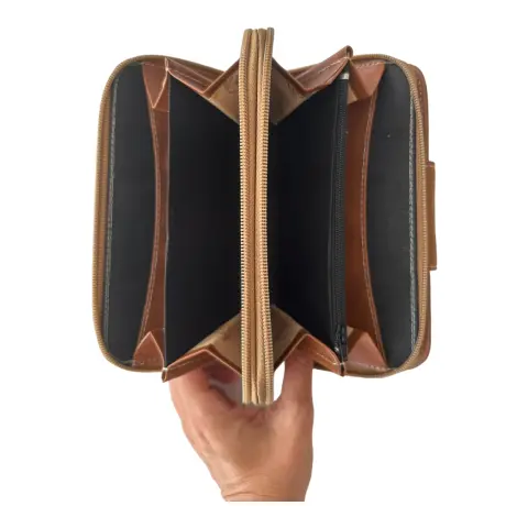 Cartera café. Cartera de piel con espacio para tarjetas, monedas y billetes. Tiene espejo.Medidas: 19x 9.5x 4