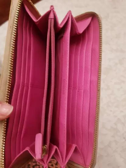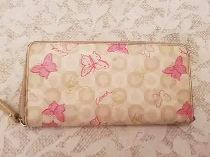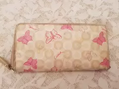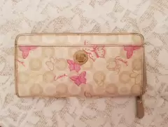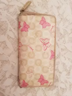 Hermosa cartera Coach color beige con tonos rosas y dorados y mariposas. Sin detalles.