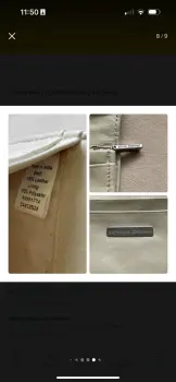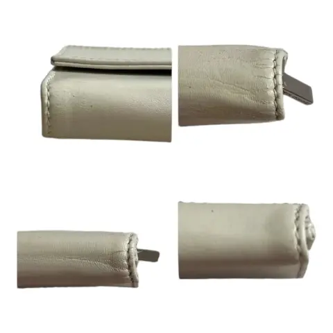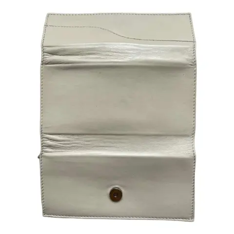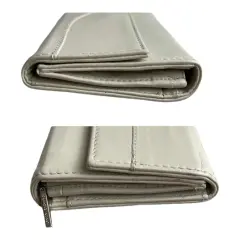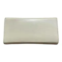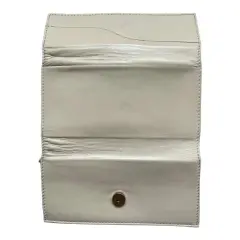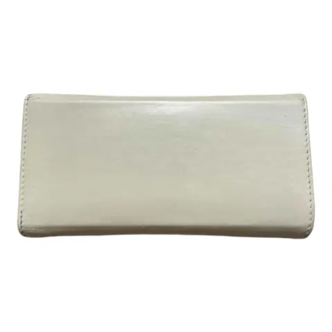 Cartera de piel con espacios para tarjetas billetes y monedas color hueso.Medidas: 18 cm de largo, 9 cm de ancho y 2.5 cm de grueso.Se le dió un baño de pintura y se manchó por dentro. No afecta el funcionamiento.