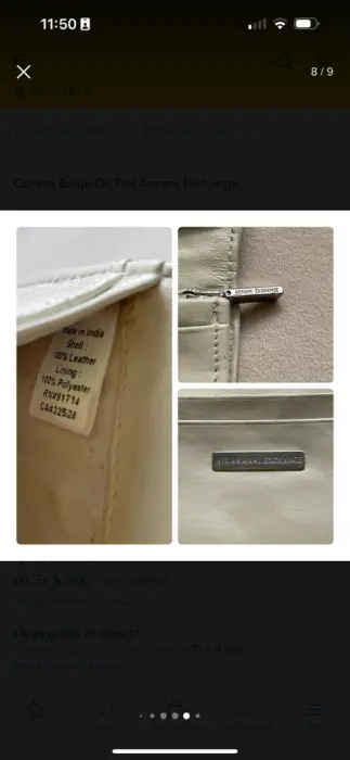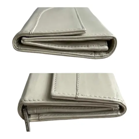 Cartera color hueso Armani Exchange. Cartera de piel con espacios para tarjetas billetes y monedas color hueso.Medidas: 18 cm de largo, 9 cm de ancho y 2.5 cm de grueso.Se le dió un baño de pintura y se manchó por dentro. No afecta el funcionamiento.