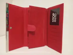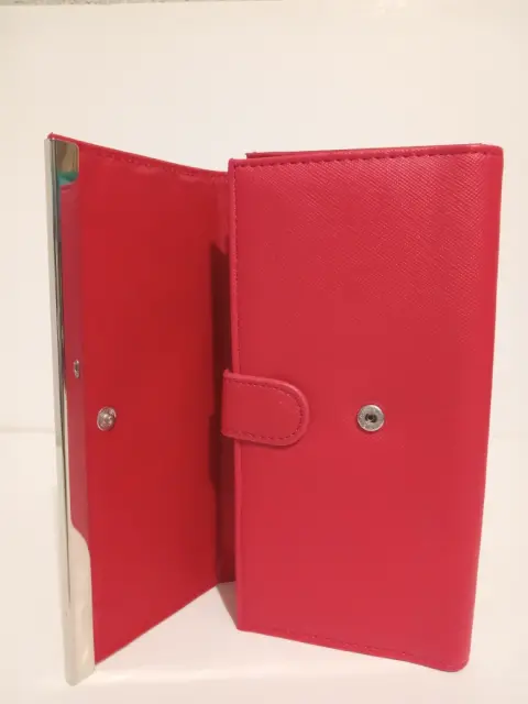 Prácticamente y con espacio para tarjetas y credenciales.Cuenta también con apartado para billetes y monedas.Cierre exterior trasero.Con aplicación metálica en la tapa.Acrílico
