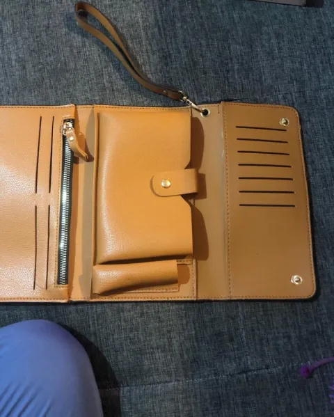 Cartea tipo coach en perfecto estado tiene para monedas tarjetas y billetes un labial y tu celular está casi nueva no tiene detalles tiene un Colgate