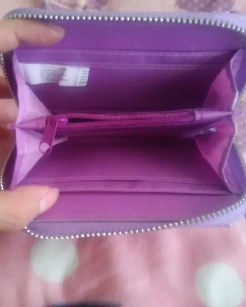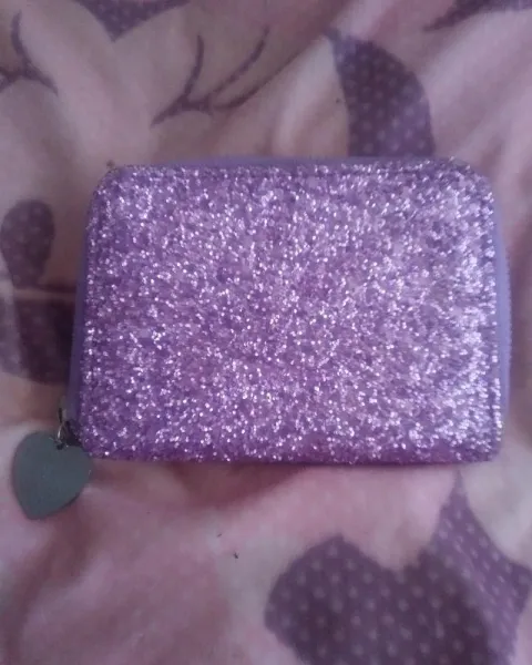 Cartera con glitter. Cartera con gritter, en color lila con espacio para tarjetas, billetes y monedas, es de buen tamaño y tiene un detalle de corazón en el cierre color rosa y con una frase.