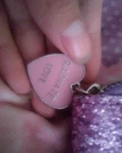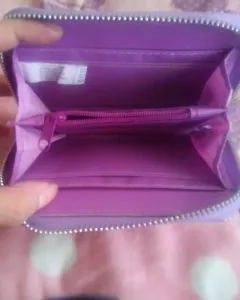 Cartera con gritter, en color lila con espacio para tarjetas, billetes y monedas, es de buen tamaño y tiene un detalle de corazón en el cierre color rosa y con una frase.