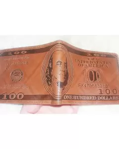 Bonita cartera tipo piel con forma de billete de 100 dólares, color cafe claro, para la suerte!Cuenta con 10 compartimentos