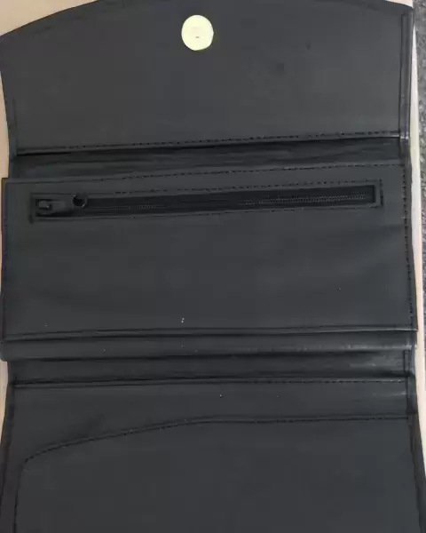 Cartera de piel. Cartera de piel vacuno, color negro, con 3 compartimientos para billetes y 1 más con cierre, tarjetero, 9 cm de alto por 19 cm de ancho