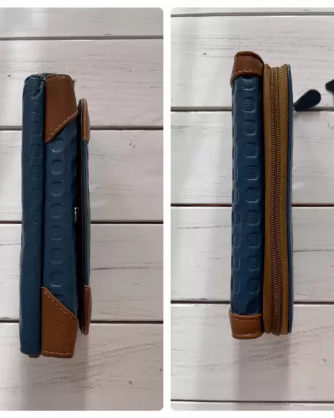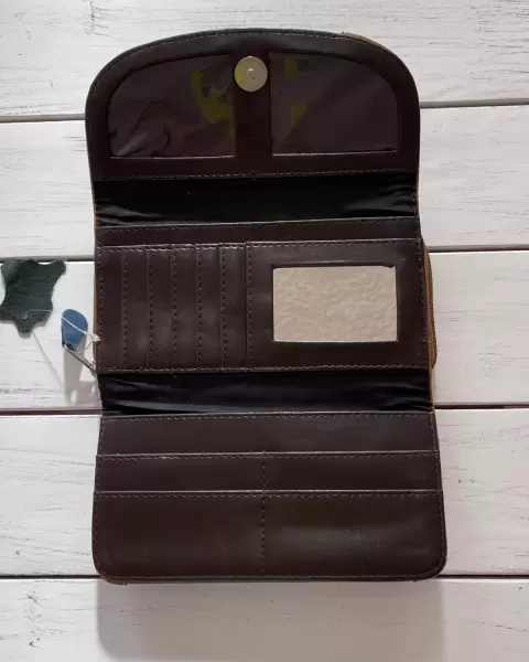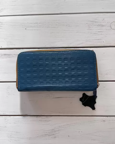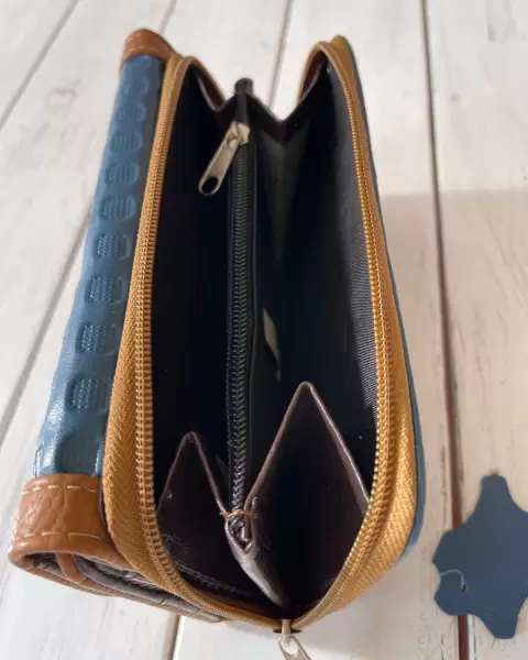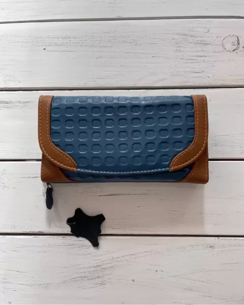 Cartera de piel hecha en México azul con café, espejo, cierra con broche de iman y cierre al otro lado. Espacio para tarjetas, billetes y monedas. Trae ciertos detalles que se ven en fotos.Medidas: 19 cm largo, 10 cm de alto y 3.5 cm grueso.