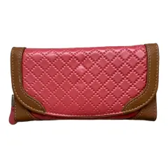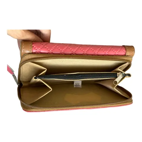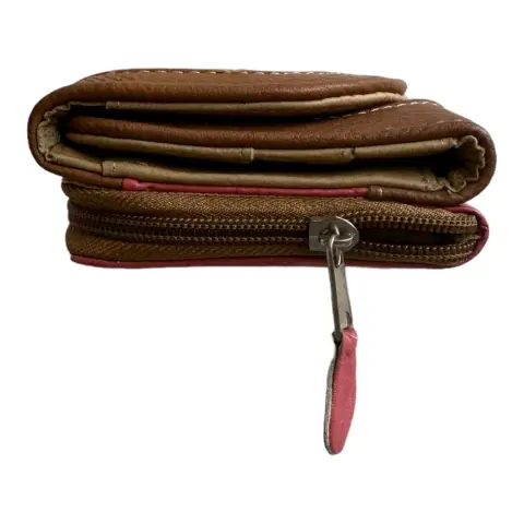 Cartera de piel rosa con café. Cartera rosa con café de piel hecha en México un espacio con monedero y cierre y otro con broche con iman, trae espejo.Medidas: 19 cm de largo, 10 cm ancho y 4 cm de grueso.