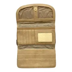 Cartera rosa con café de piel hecha en México un espacio con monedero y cierre y otro con broche con iman, trae espejo.Medidas: 19 cm de largo, 10 cm ancho y 4 cm de grueso.