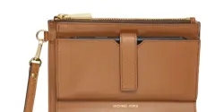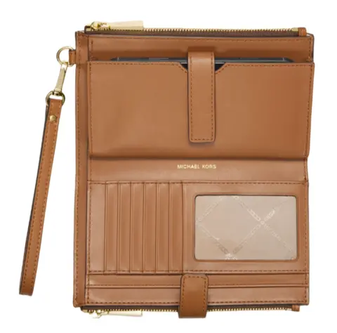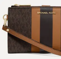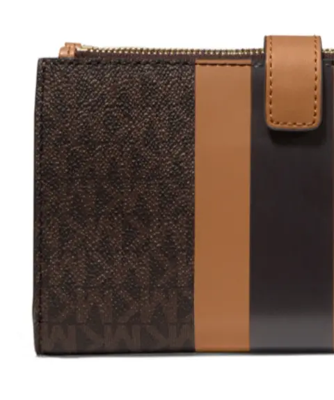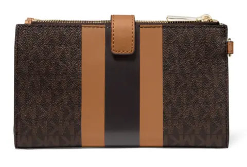 Cartera en piel monogram. MICHAEL KORS. **NUEVA TOTALMENTE**Cartera Michael Kors elaborada en piel color café oscuro, diseño monogram, compartimento principal imantado, asa suave y nombre de la marca al frente. Interior con ventanilla para identificación, ranuras para tarjetas, billetera y monedero.100% piel