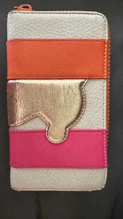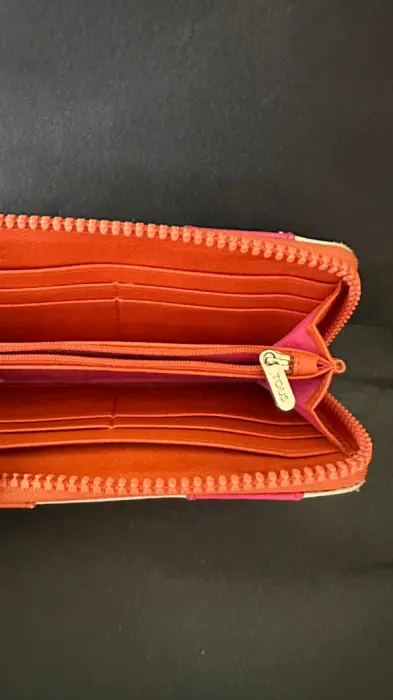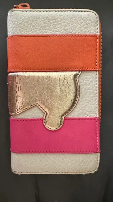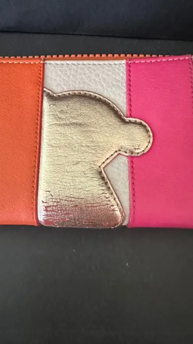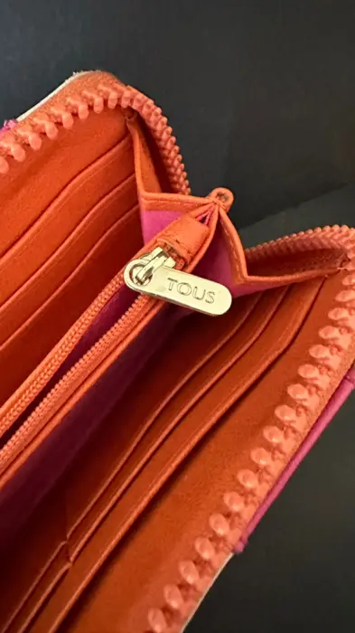 Cartera grande Tous con cierre sencillo de piel con oso dorado al frente , tiene espacio para monedas, dos espacios para tarjetas y dos espacios para billetes. Usada. Incluye el certificado de autenticidad Tous .