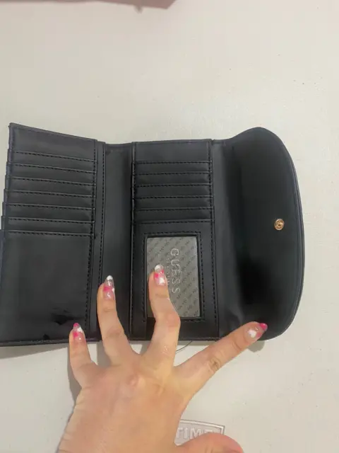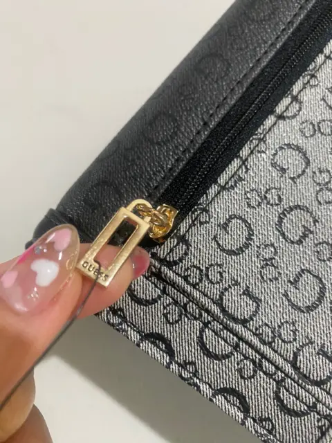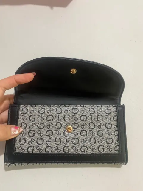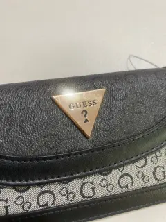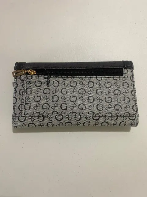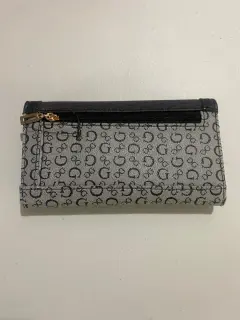 CARTERA GUESS COLOR GRIS CON NEGRO CON MONOGRAM DE LA MARCA, AL FRENTE TIENE LA PLACA DORADA DE LA MARCA UN POCO RAYADITA PPRQUE SE LE CAYÓ ELPLÁSTICO QUE LA CUBRIA. Tiene cierre para monedas. NUEVA SIN ETIQUETA.