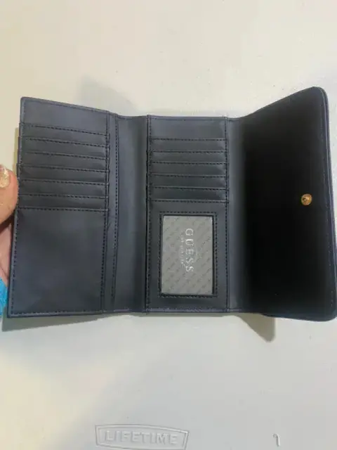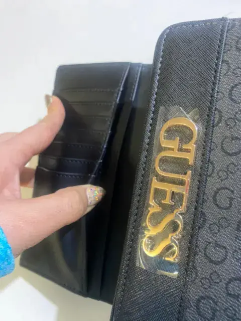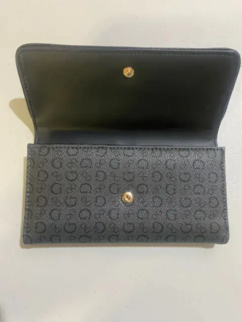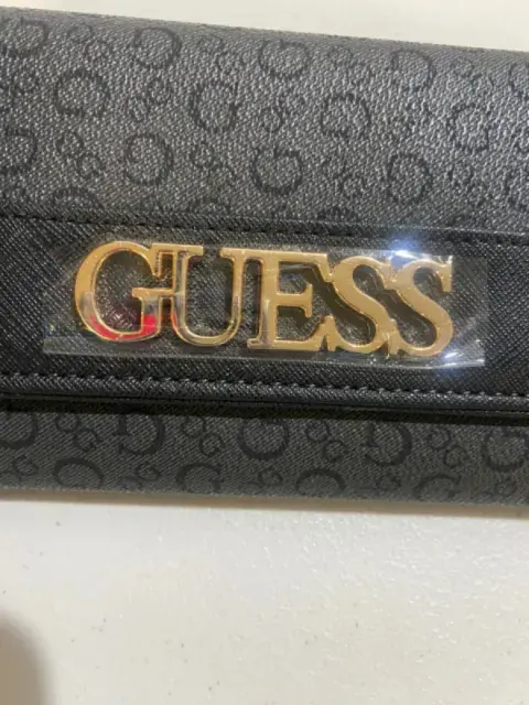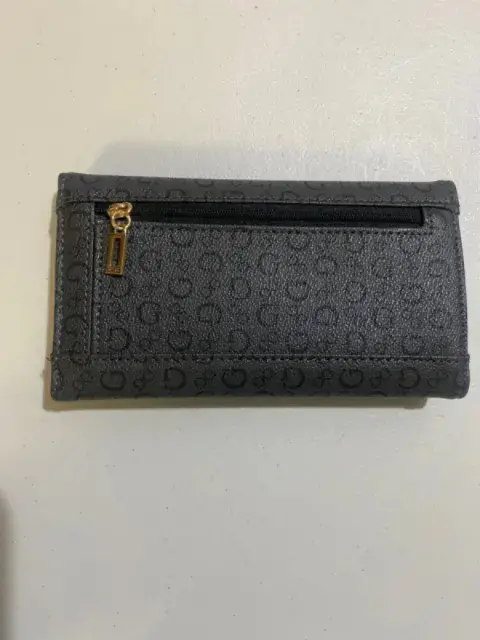 Hermosa cartera Guess, color gris y negro con monogram de la marca, marca grande visible al frente en color dorado. Tiene cierre en la parte de atrás para monedas. Totalmente nueva sin detalles