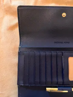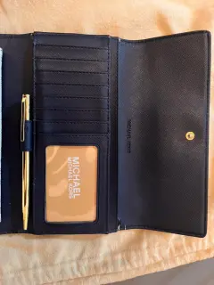 Es una cartera original, la versión americana que viene con la pluma incluida, es usada y es marca Michael Kors