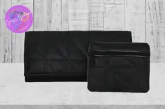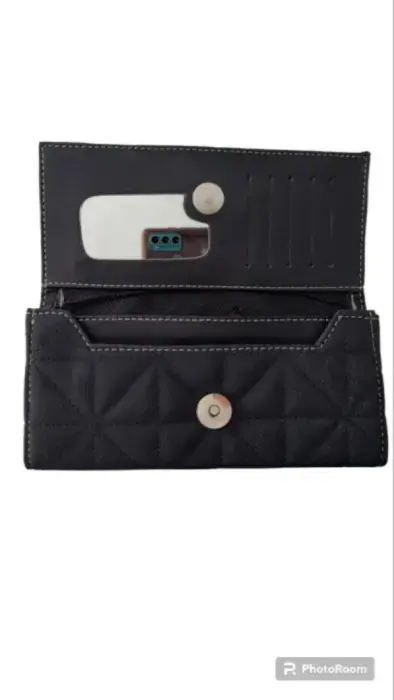 Cartera negra. Cartera sintética negra ,con espejo ,apartados para tarjetas ,cierre para monedas ,diseño de rombos .