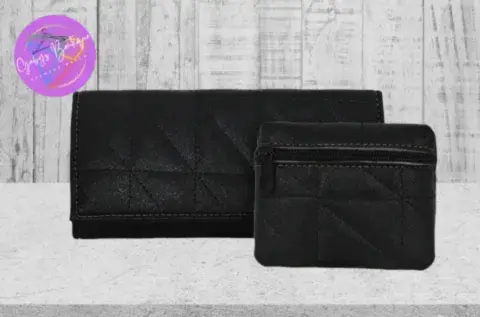 Cartera sintética negra ,con espejo ,apartados para tarjetas ,cierre para monedas ,diseño de rombos .