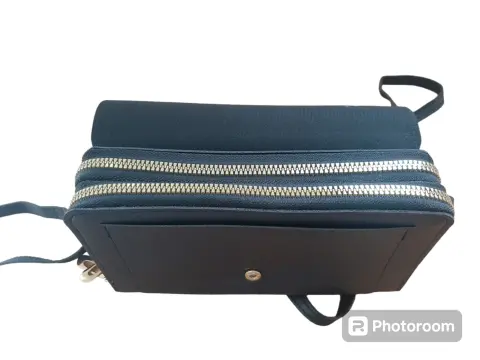 Cartera para Dama color negro con correa, doble compartimento con cierre dorado y detalles por dentro en color rosa, nueva, marca Endaycon.